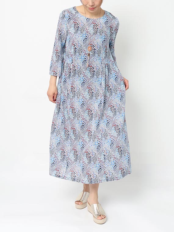 繊細なモザイク柄のプリント生地で美しく仕立てた七分袖のワンピースです。