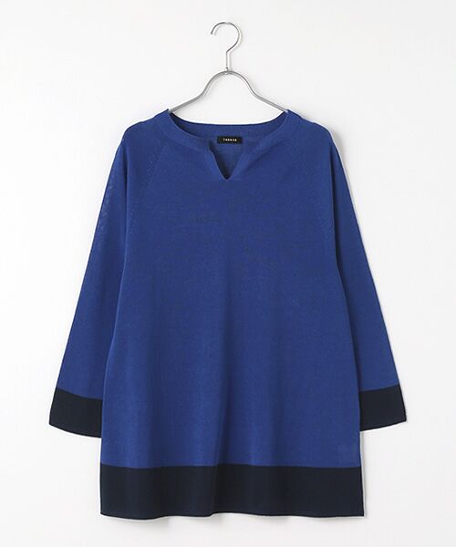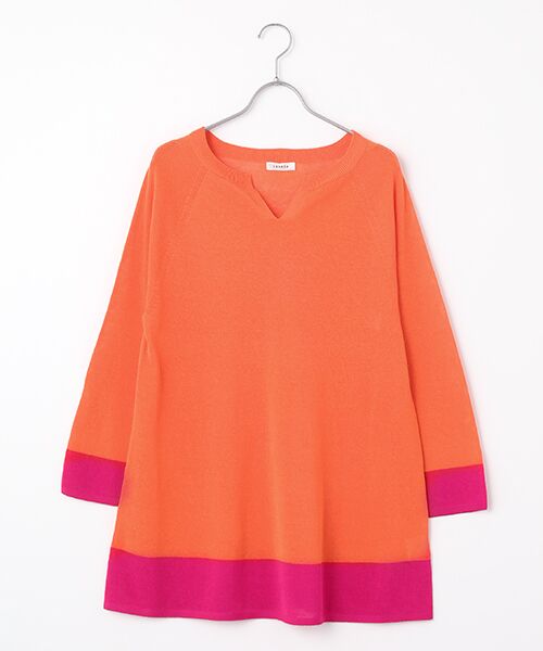 あざやかなカラーで目を惹くニットチュニックです。袖口と裾に大胆な配色を施しました。お顔周りをすっきりと見せるキーネックもデザインのポイントで、こなれた雰囲気を演出します。*手洗い可【編地】ほど良い透け感のある天竺編みの素材です。ナチュラル感や軽さ、清涼感など春夏にふさわしい素材感が詰め込まれています。