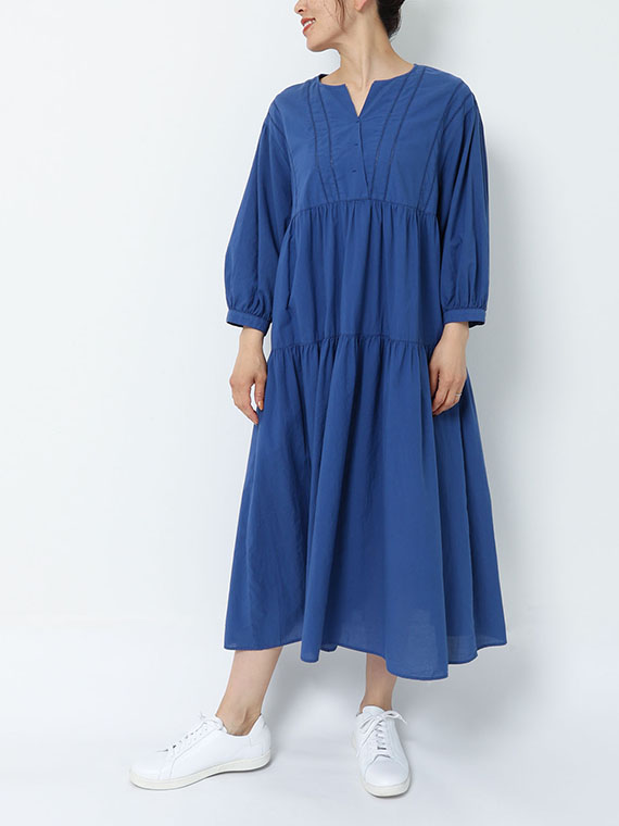 ギャザーがふんだんに入った三段ティアードのワンピースは動くたびに表情が変わり遊び心を誘います。シロのシンプルなスニーカーと合わせた大人のカジュアルスタイルです。 モデル身長:162cm