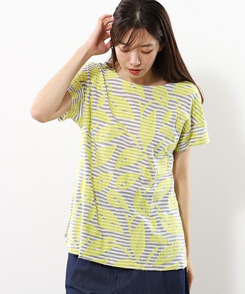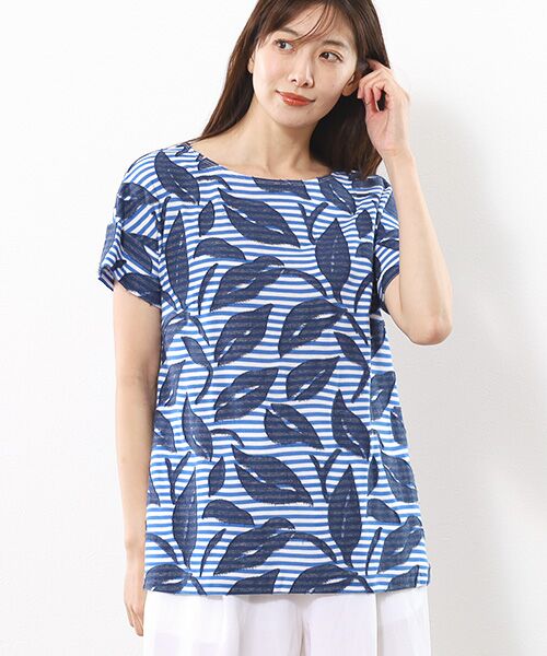 涼し気なボーダー&シルエットフラワー柄のプルオーバータイプのブラウスです。