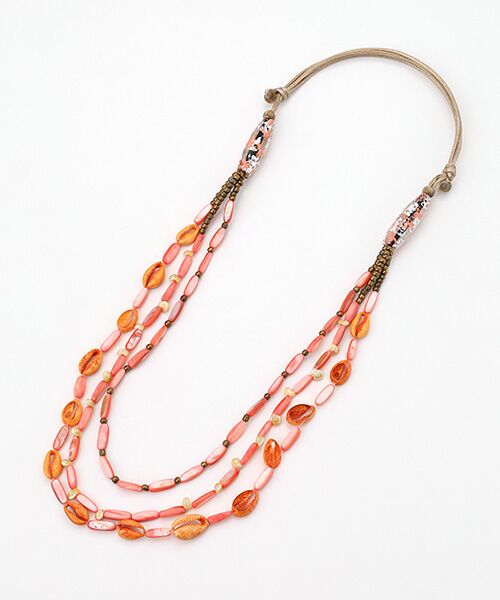ナチュラルな造形が美しいシェルとビーズを組み合わせた、胸元に3連で揺れるネックレス。素朴になりがちな組み合わせを、明るく優しいカラーでモダンに仕上げました。長さの調節ができるアジャスト機能がついていますので、お気に入りの長さでおつけください。(一番短い連で全長94cm)フィリピンの『UNIJEL』(ユニジェル)の製品です。【UNIJEL】セブ島でハンドメイドされており、南国らしい素材とカラフルな色を特徴としています。TABASAの服に合わせやすい色をオリジナルでリクエストしています。