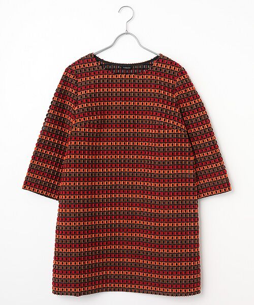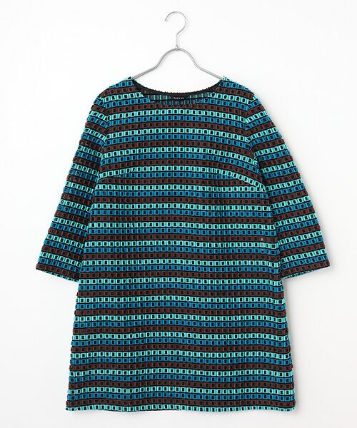 深みのある色合いとブロックが並んだ独特なボーダー柄、ベルベットのような毛足のある表面感が目を惹くチュニックです。