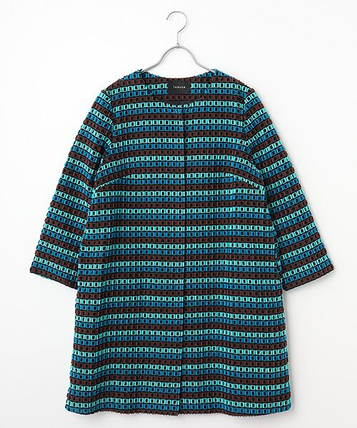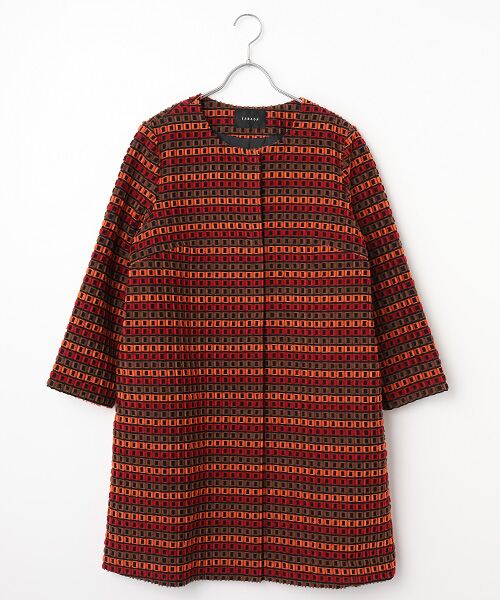 深みのある色合いとブロックが並んだ独特なボーダー柄、ベルベットのような毛足のある表面感が目を惹く薄手のコート(羽織りアイテム)です。