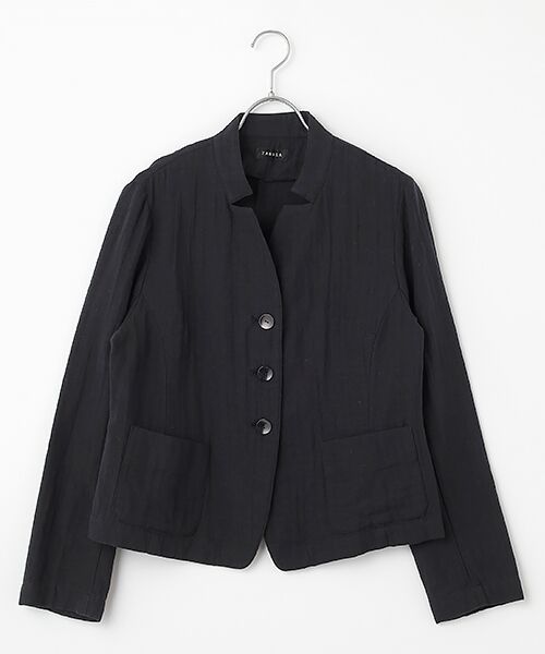 テーラードカラーのような、マオカラーのような、首元を小さく覆う衿のついた接結素材のジャケットです。