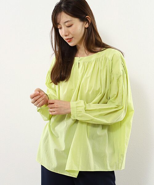 衿ぐりや肩回りにふんだんに入れたギャザーがモダンな印象のブラウスです。