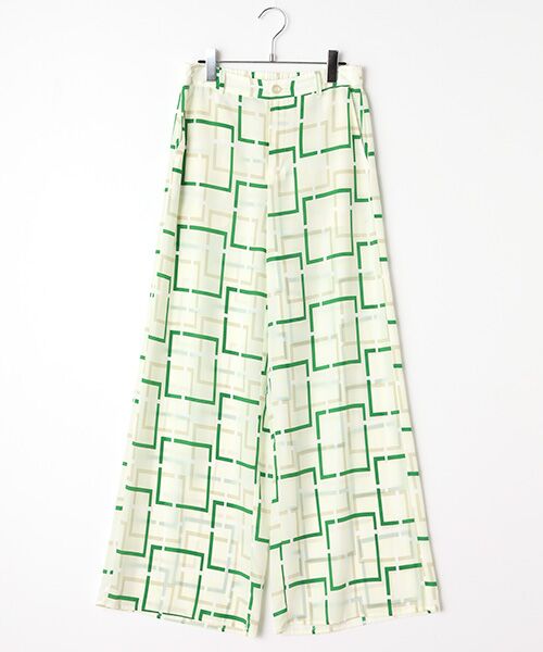 ほど良いゆるさのあるストレートパンツで、ゆるやかに裾に向かって広がりがあります。キュロット感覚でお召しいただくことができ、こなれ感を演出します。前にファスナー開きがあり、きちんと感がありますが、後ろウエストがゴム仕様で、脱ぎ着もラクで快適にお召しいただけます。*前両脇にポケットつき*手洗い可【生地】軽やかで美しいドレープ性のある生地に、モダンな色使いのジオメトリック柄をプリントした生地です。シワになりにくく、生地の扱いやすさもポイントです。