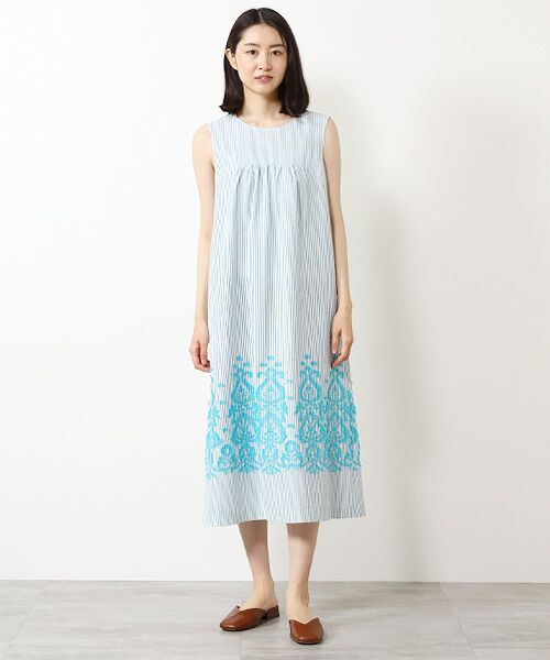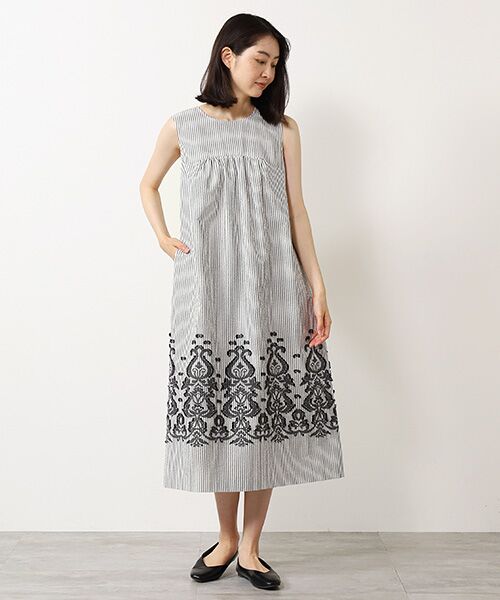 重厚なイメージになりがちなオーナメント柄を、軽やかなサッカーストライプ素材に載せて仕立てたノースリーブワンピースです。