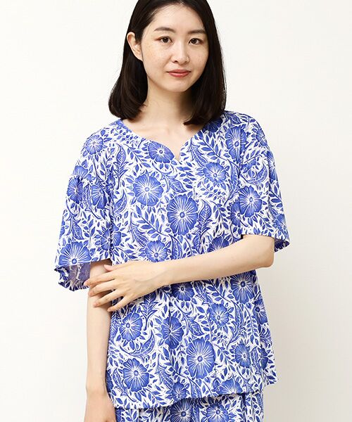 オフベースに一色だけのプリントを載せた涼しげな印象のプルオーバータイプのブラウスです。