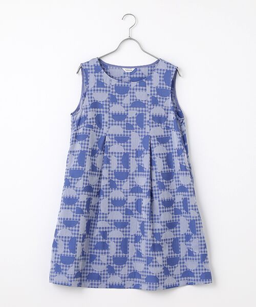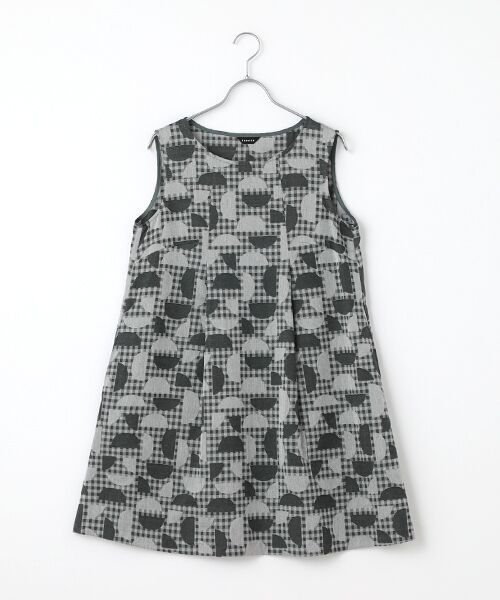 【タバサ オリジナル素材】首元から入れたタックがタテのラインを強調し、すっきりとお召しいただけるノースリーブのチュニックです。シルエットはAラインで、細身パンツでもワイドパンツでも相性が良く、気分に合わせてコーディネートできます。透け感がほとんどないのもうれしいポイントです。*両脇にポケットつき【生地】タテ糸にシロ糸、ヨコ糸にカラー糸を使用して、ジャガード織りでギンガムとハーフサークル等の幾何柄を表現したタバサオリジナルの素材です。軽く柔らかで、さわってみると微妙に凹凸感があります。デリケートな素材ですので、着用時にはベルトやバック及び周囲の壁や椅子などの表面の粗いものとの摩擦や引っかけにご注意ください。