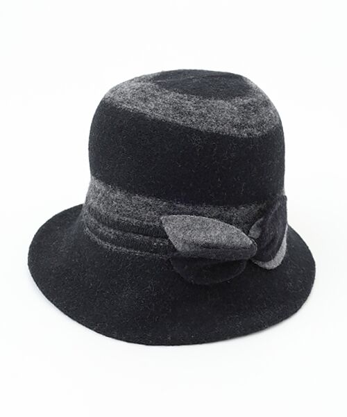 クラウン全体がなだらかに丸く、「釣鐘」=クロッシェという名称のついた帽子です。フェルトのようなウールを縮絨したような風合いをもち、リボンを巻いたようなラインが入っています。前だけ小さく持ち上がったブリム(つば)と、葉っぱのようなリボンモチーフがクラシックな雰囲気を演出します。