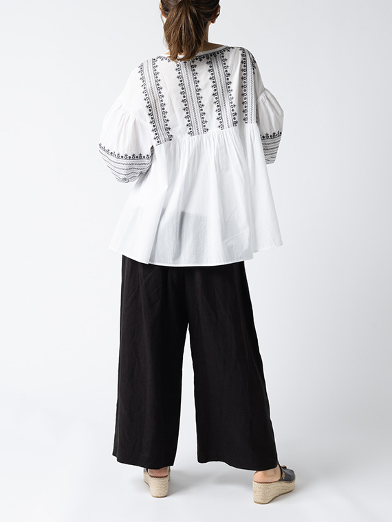 前にも後ろにもステッチ刺繍がふんだんに入ったナチュラルでガーリーなブラウスをクロのワイドパンツとコーディネートしました。クールでモダンに雰囲気が演出される大人のカジュアルスタイルです。