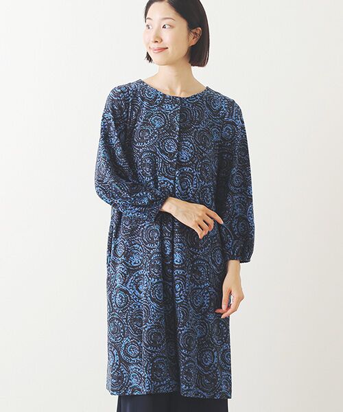ストレッチ性のある柔らかいローゲージ天竺を裏目使いして、抽象的なドットサークル柄を捺染プリントをしています。