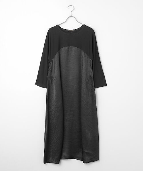 伸縮性のあるカットソー素材の上身頃+袖に、上品な光沢感のあるサテン素材のスカートがドッキングしたコクーンシルエットのワンピースです。