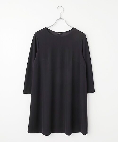 ミニマルデザインの七分袖のチュニックです。背中心に切替を入れ、すっきりをしたバックスタイルを演出します。シルエットはAラインで、きれいなドレープが出るのが特徴です。サッと一枚着るだけでサマになり、透け感もないのでリラックスしてお召しいただけます。*手洗い可【生地】ストレッチ性の高いリブ素材です。透け感がなくソフトな風合いで、シワになりにくいのもポイントです。リブ地特有のタテ畝で、すっきりとスタイルアップして見えます。
