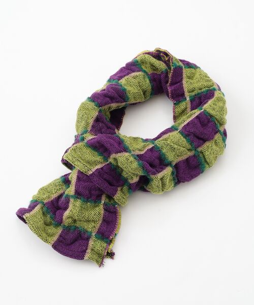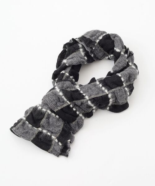 印象的なチェッカー柄が目を惹くミニマフラーです。差し込むだけで簡単に形が決まる使い勝手の良いアイテムです。ゆるくシャーリングがかかったような仕上がりで、ふくらみ感が温かな雰囲気を演出します。贈り物にもぜひ!