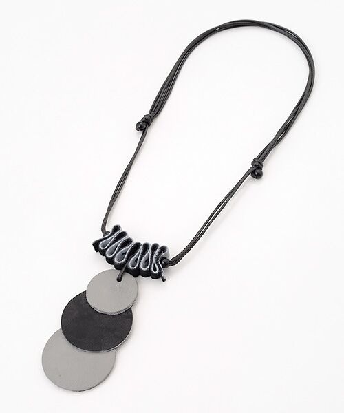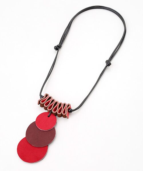 3つのずらしながら重なったレザーサークルとなみなみのテープモチーフが印象的な存在感のあるネックレスです。大胆なモチーフでありながら意外と合わせるものを選ばず、コーディネートで活躍すること間違いなしの一点です。軽く、肩のこらないつけ心地なのもうれしいポイントです。長さの調節ができるアジャスト機能がついていますので、お気に入りの長さでおつけください。フィリピンの『UNIJEL』(ユニジェル)の製品です。【UNIJEL】セブ島でハンドメイドされており、南国らしい素材とカラフルな色を特徴としています。タバサの服に合わせやすい色をオリジナルでリクエストしています。