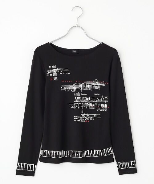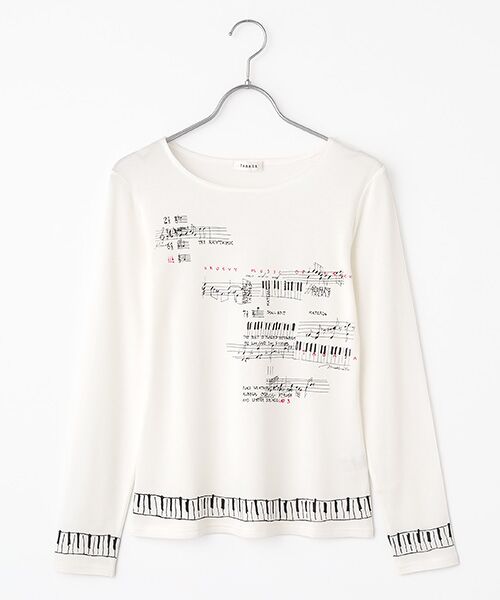 裾や袖口にまで鍵盤がプリントされ、楽しい雰囲気を演出します。