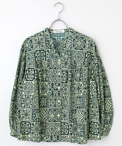 スキッパーブラウスのような小さなスタンドカラーとV字の開きをもつコットン100%のローン素材の前開きブラウスです。