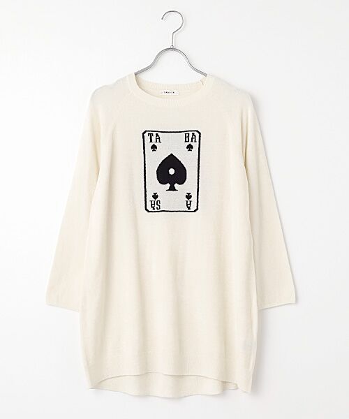 トランプカードのエースをモチーフとして編み込んだニットチュニックです。細かな毛羽立ちが深みのあるカラーを演出して落ち着いた雰囲気ながら、楽しさを表現したアイテムです。ほど良い厚みで編み上げられており、アウターを羽織ってもすっきりとお召しいただけます。肩回りがゆったりとしたラグランスリーブにゆとりのあるシルエットで、リラックスした着心地です。【編地】モール糸と呼ばれる毛羽のある糸で編んだ天竺素材でモチーフをインターシャで入れました。特徴は短い毛足が毛羽立ち、ほんのりと光沢のある表情を見せることです。一見ベロアに似たその表情は上品な見た目で、ニットにありがちなゴワゴワした雰囲気が無く、柔らかい肌ざわりが人気です。