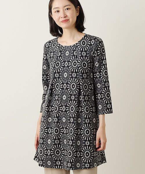 すっきりとしたネックラインから前身頃に2本のタックを施したAラインシルエットのチュニックです。