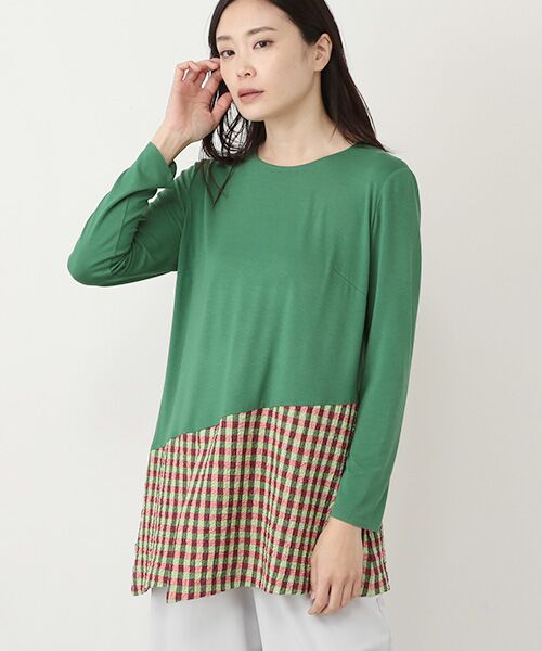 無地とチェックをシャープなバイアスで切り替えた、ゆるやかなAラインシルエットのチュニック。