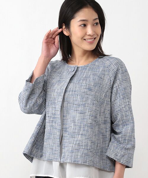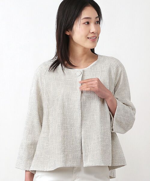 ラグランスリーブが肩を丸く包み込むノーカラーのジャケット。