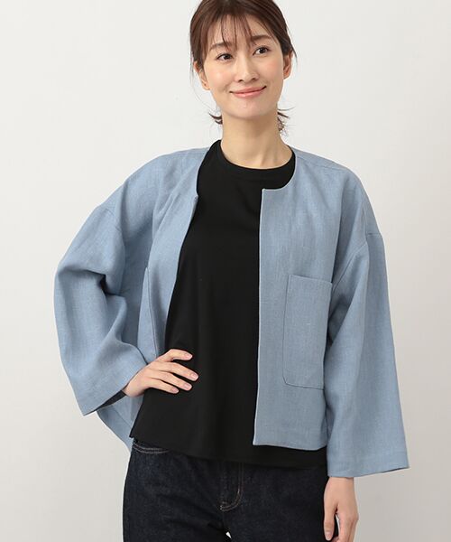 脇に向かってラウンドしたヘムラインを持つノーカラージャケット。