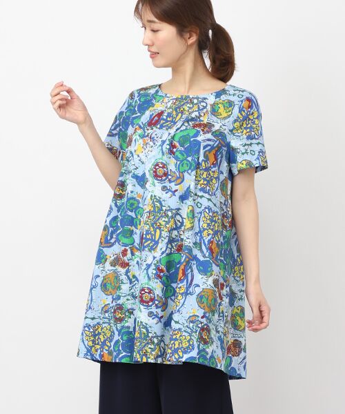 【TABASAオリジナル素材】衿ぐりからタックを入れて、立体的に仕立てたAラインシルエットのチュニック。適度なゆとりが涼しさにつながり、暑い季節までシーズン永くお召しいただけます。*両脇にポケットつき*手洗い可【生地】ストライプ状に地柄があるドビー生地に、インクジェットでカラフルなフラワーベース柄をアート感あふれるタッチでプリントしたTABASAオリジナル素材です。清涼感のある適度なハリ感で、肌に張りつくことなくお召しいただけます。
