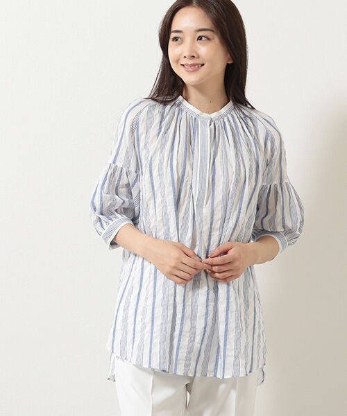 フランスのアンティークシャツのディテールを入れた、バンドカラーのチュニックです。袖の切替や衿ぐりにギャザーを入れ、こなれ感のあるモダンな印象のアイテムに仕上げました。*手洗い可【生地】Pitchouneで大人気夏素材、薄手のシャーリング生地です。通気性に優れており、軽くてさらっとした肌ざわりが特徴の生地です。爽やかな印象を与えてくれるストライプ(カラー01、カラー02)と、コーディネートの主役になってくれるマルチストライプ(カラー03)の2柄=3色での展開です。