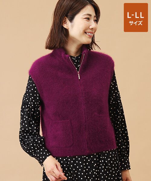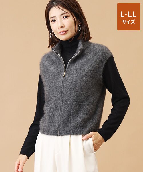 3色展開。カシミヤ75%・シルク25%の編地に起毛加工を施したジップアップのニットジレ。着心地が軽く、ふわふわとした肌触りで、あたたかさも◎。首周りもあたたかいスタンドカラー、便利なポケット付きで、上品さと機能性を兼ね備えたデザイン。秋冬のレイヤードスタイルに活躍する頼れる一枚です。