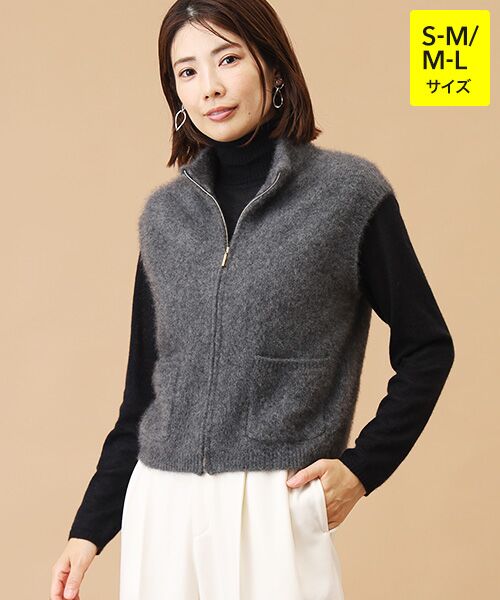 3色展開。カシミヤ75%・シルク25%の編地に起毛加工を施したジップアップのニットジレ。着心地が軽く、ふわふわとした肌触りで、あたたかさも◎。首周りもあたたかいスタンドカラー、便利なポケット付きで、上品さと機能性を兼ね備えたデザイン。秋冬のレイヤードスタイルに活躍する頼れる一枚です。