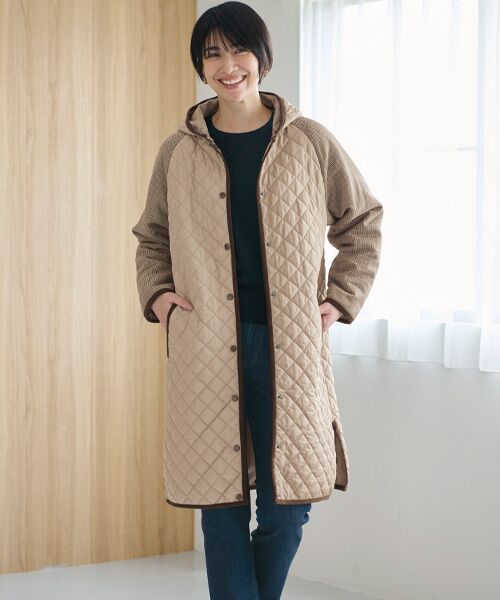 身頃を柔らかなタフタ素材のキルティング、ラグラン袖をガンクラブチェック柄で切り替えた異素材デザインのコートです。ゆったりとしたボックスシルエットで、身頃も袖も暖かな中綿入り。コーデュロイ素材の配色トリミングもお洒落です。