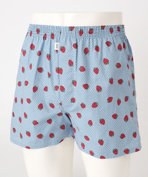 イチゴプリント 5枚はぎトランクス。ヘリンボン柄をベースにイチゴを散りばめたイチゴ柄プリントです。肌側がパイル仕様のウエストゴムを採用し、柔らかな肌触りで心地よく、5枚はぎにすることで動きを妨げない解放感のある履き心地を実現しています。