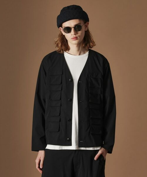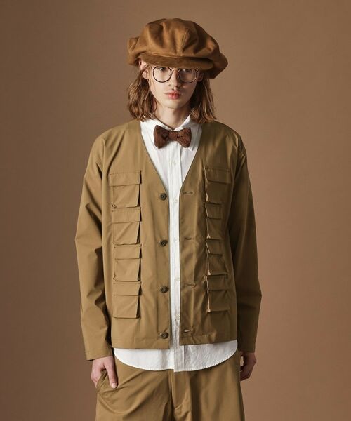 縦に連続して並んだミニポケットが印象的且つ、何を入れようか色々と想像が膨らむノーカラーブルゾン。