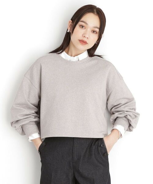 クルーネックのラメ裏毛トップスは、ほどよい丈感でスタイリングに取り入れやすい一着です。