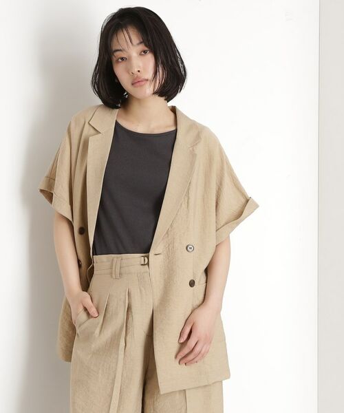 この半袖テーラージャケットは、Wブレストデザインが特徴で、スタイリッシュさを兼ね備えています。