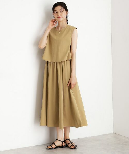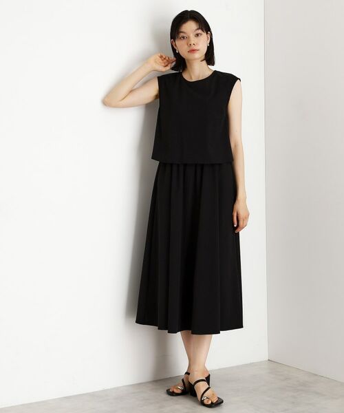 セットでコーディネートしたように見えるドッキングデザインはノースリーブに加え、トップス部分のフレアシルエットでスタイルアップを実現。