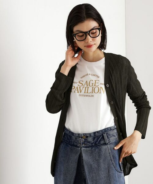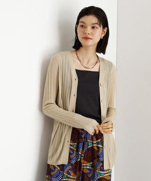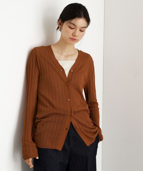 ランダムリブが施された透け感と清涼感あふれるニットカーディガンは、Vネックにボタン付きのシンプルで洗練されたデザインです。