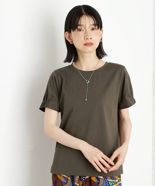 袖口にタックのデザインがさりげなく施されたTシャツは、シンプルでありながらすっきりとした印象の一着です。