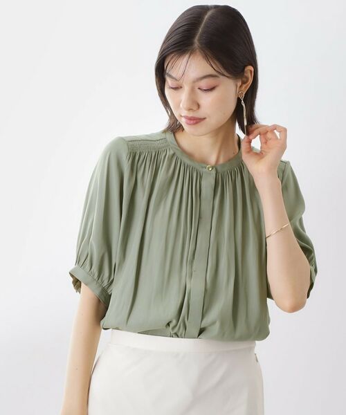 オフィスシーンにもぴったりの洗練されたデザインで、5分袖のパフリーブが女性らしさを軽やかに演出。