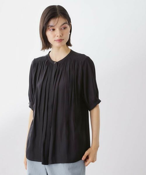 ビンテージサテン素材を使用した上品なブラウスは、バンドカラーにより首元がすっきりと仕上げられ、きちんとした装いを実現します。