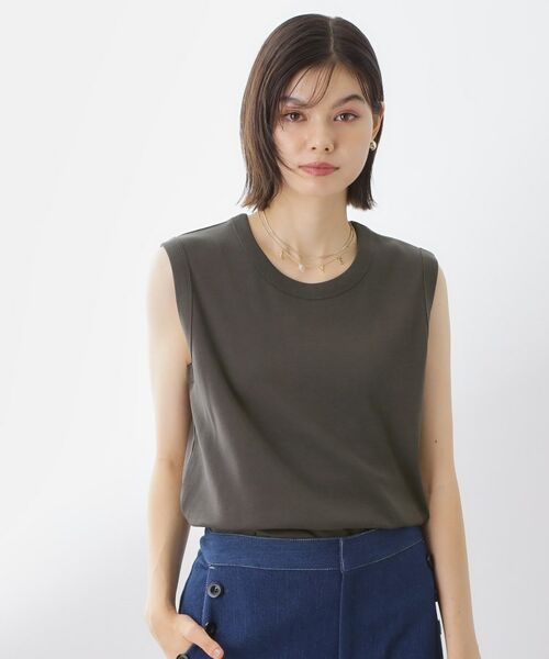 汗染み防止機能を備えたタンクトップは、衿ぐりにしっかりとした切替えデザインを採用し、上品で洗練された印象を演出します。
