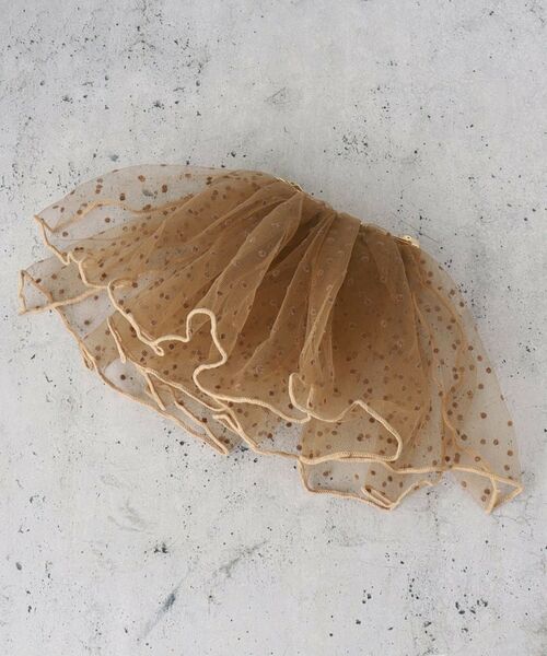 フロッキードット柄のチュール生地を大胆にあしらった大振りフリルが魅力のバレッタです。結んだ髪に留めるだけで、一気に華やかさがプラスされる点がポイント。丁寧な加工により、フリル部分がふんわりと広がりシンプルなスタイルにアクセントとして映え、上品で個性的なヘアアクセサリーとしてお楽しみいただけます。※照明の関係により、実際よりも色味が違って見える場合があります。また、パソコン・スマートフォンなどの環境により、若干製品と画像のカラーが異なる場合もございます。本商品は、ご注文確定後に取り寄せにてお客様への出荷手配をさせていただきますので、お届けまでに7~10日前後かかる場合がございます。また、商品は他社サイトと在庫を共有しているため、ご注文いただいた商品が欠品となり、キャンセルとなる場合がございます。
