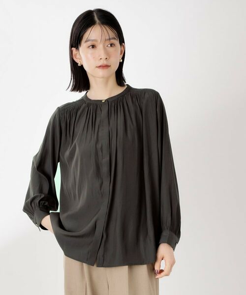 細かく入ったシャーリングギャザーが際立つサテンブラウスは、クラシカルなデザインと上品さが融合した逸品です。