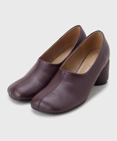 オブリックトゥが印象的なコロンとしたモードなデザインのパンプスです。