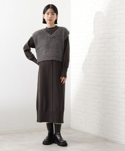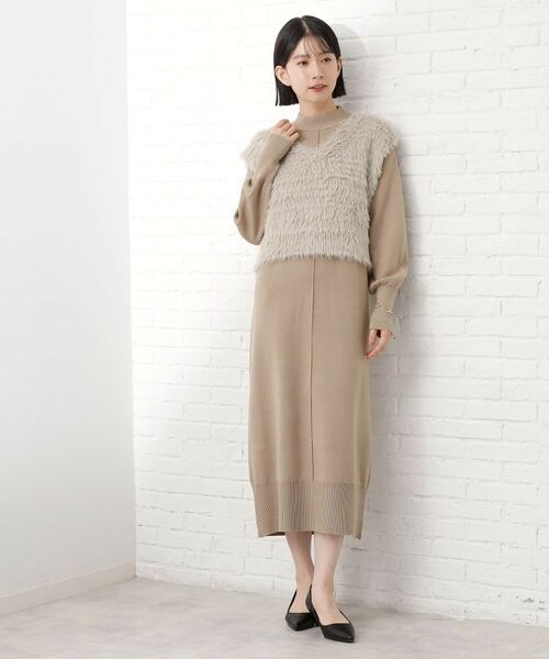 ハイネックニットワンピースと、トレンドのフェザー起毛ベストがセットになったお得なアイテムです。