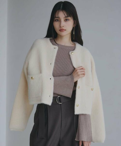 このカーディガンジャケットは、スタンドフリルのインナーと合わせて、クラシカルで洗練された着こなしにも、ロゴプリントなどを取り入れたカジュアルコーディネートにもマッチ。