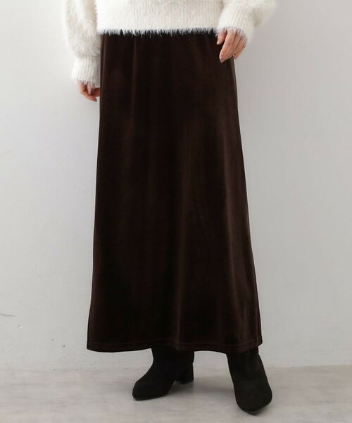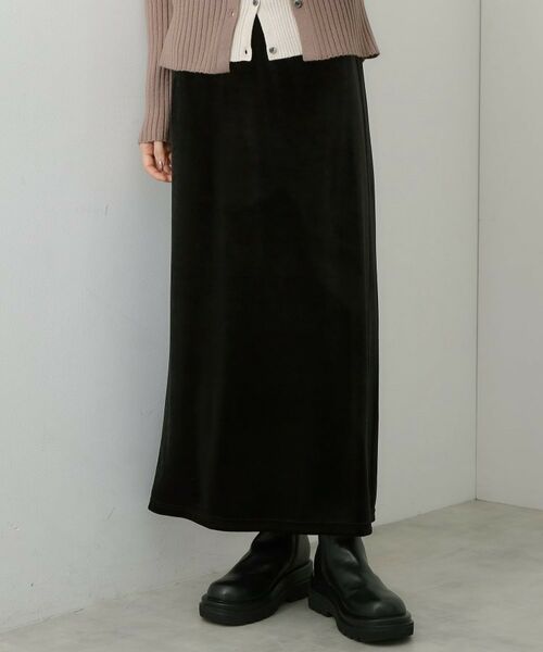 光沢とドレープ感が美しいベロア素材を使用したナロースカートは、上品な印象ながらもカジュアルなニットなどとの相性が良く、普段使いに最適なアイテムです。