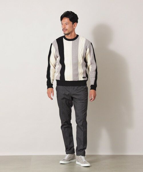 【THE URBAN COLLECTION】ストライプフィッシャーマンセータースコットランドの漁師の仕事着が起源とされるフィッシャーマンセーターをスコッチハウス風に仕上げています。複雑なケーブルを組み合わせたオリジナルティのあるストライプ柄をニットでは表現が難しいインターシャで表現しています。毛羽の少ない糸で編んでいるので非常に立体感のある綺麗な柄に仕上がっています。左裾にオリジナルレザーパッチが付きます。 【THE URBAN COLLECTIONとは】「THE URBAN COLLECTION」は “上質で洗練された都会的なスタイル” をコンセプトに、過去のアーカイブをモダンにアレンジしたアイテムを中心にモノトーンでまとめた特別なコレクション。織ネーム・下げ札は黒のラベルで統一し通常のラインとの差別化を図ります。※この商品はサンプルでの撮影を行っています。実際の商品とイメージ、仕様が異なる場合がございます。モデル(代表画像):H184 B95 W78 H94 着用サイズ:L