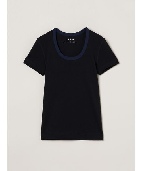 バイカラーのバインダーネックでよりネックラインを強調し、まるでネックレスを付けるかのような感覚。1枚でも胸元がさみしく見えず、ジャケットのインにしてもひと癖ある着こなしに。